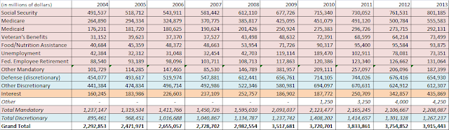 To start, we take a look at a summary of the budget. We all know that budget deficits have exploded beginning in fiscal year 2009. It should be noted that this is a George W. Bush budget and not an Obama budget.